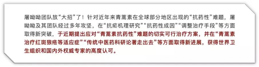 經過三年多科研攻堅,屠呦呦團隊在“抗瘧機理研究”“抗藥性成因”“調整治療手段”等方面終獲新突破,最終找到新的治療應對方案:一是適當延長用藥時間,由三天療法增至五天或七天療法;二是更換青蒿素聯(lián)合療法中已產生抗藥性的輔助藥物,療效立竿見影。