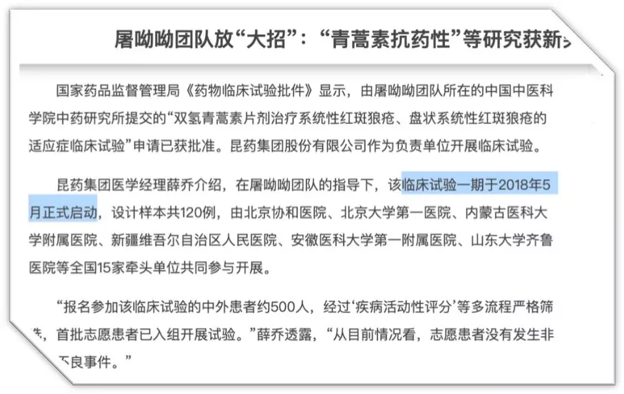 根據(jù)國家藥品監(jiān)督管理局《藥物臨床試驗批件》顯示,由屠呦呦團隊所在的中國中醫(yī)科學院中藥研究所提交的“雙氫青蒿素片劑治療系統(tǒng)性紅斑狼瘡、盤狀系統(tǒng)性紅斑狼瘡的適應癥臨床試驗”申請已獲批準。昆藥集團股份有限公司作為負責單位開展臨床試驗。
