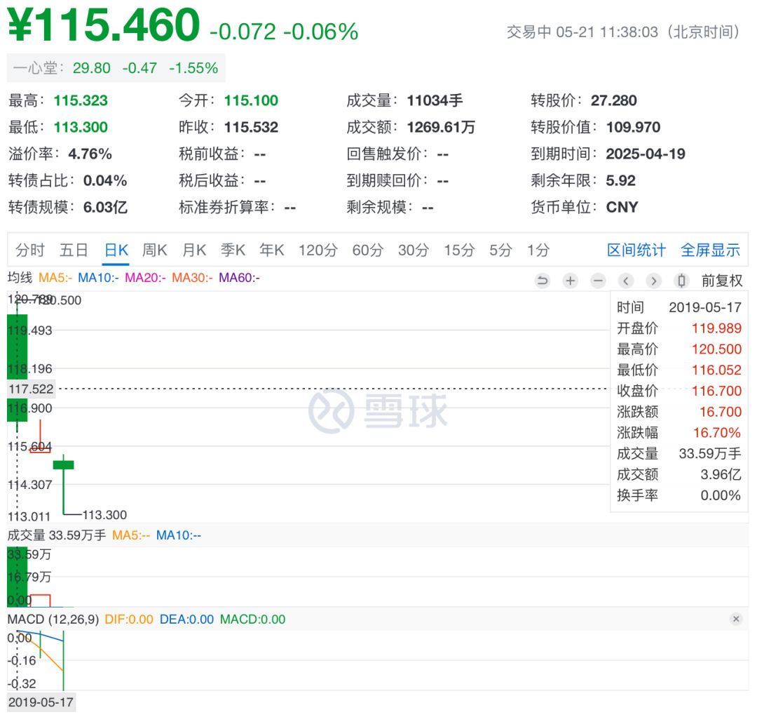 一心轉(zhuǎn)債于上周五即2019年5月19日正式上市交易。