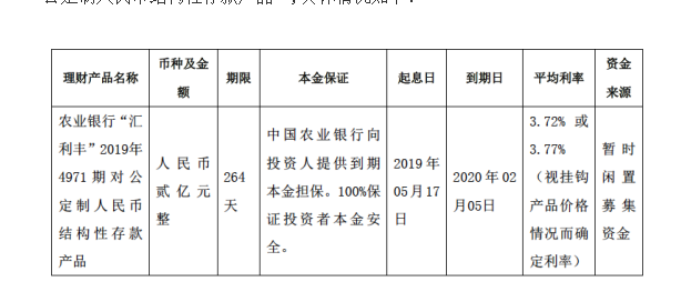 公司與中國農(nóng)業(yè)銀行股份有限公司麗江分行簽訂了《理財產(chǎn)品協(xié)議》,公司以暫時閑置募集資金20,000萬元購買“農(nóng)業(yè)銀行‘匯利豐’2019年4971期對公定制人民幣結(jié)構(gòu)性存款產(chǎn)品”,具體情況如下: