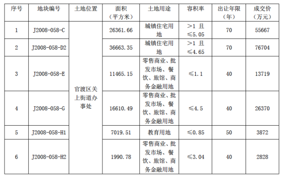 公司下屬全資子公司昆明市官渡區(qū)城中村改造置業(yè)有限公司競得昆明市官渡區(qū)關(guān)上街道辦事處的六宗國有建設(shè)用地使用權(quán),并與昆明市公共資源中心分別簽訂了《昆明市國有建設(shè)用地使用權(quán)交易掛牌出讓成交確認(rèn)書》,具體情況如下:
