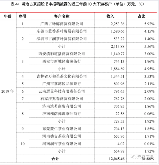 從公司商業(yè)模式看,瀾滄古茶依舊是常見的收購毛茶,制作普洱茶并銷售普洱茶,并且是線下銷售為主,對經(jīng)銷商的銷售為主;從招股書申報稿披露的近三年下游主要客戶看,存在小商戶與公司做大生意的疑點。比如,廣西古味醇商貿(mào)有限公司2018和2019年是瀾滄古茶第一大下游客戶,2017年是第二大下游客戶,瀾滄古茶每年對其銷售額高達(dá)2,000萬元左右,可公示系統(tǒng)查詢該公司成立于2017年1月11日,注冊資本僅200萬元,但是當(dāng)年與瀾滄古茶的采購額高達(dá)2,087萬元,位居第二大客戶;接下來都是第一大客戶。再比如東莞市藍(lán)香茶葉貿(mào)易有限公司成立于2014年7月14日,注冊資本僅50萬元,其關(guān)聯(lián)企業(yè)深圳市古瀾茶葉貿(mào)易有限公司成立于2017年1月17日;但是兩者2017年就是瀾滄古茶第一大下游客戶,2018-2019也是瀾滄古茶第二大下游客戶,瀾滄古茶銷售金額也達(dá)2,000萬元左右。類似的,第三大下游客戶是西安滇彩道播商貿(mào)有限公司成立于2017年7月12日,注冊資本僅100萬元,其關(guān)聯(lián)方系西安市新城區(qū)秦瀾茶行小店;但是他們2017-2019年向瀾滄古茶的采購高達(dá)1,058萬元、1,296萬元、1,885萬元。公司第四大下游客戶是吉林省萬和圣茶文化有限公司,也是2017年1月19日成立且注冊資本僅50萬元的自然人控制小公司,但是2017-2019年向瀾滄古茶采購分別高達(dá)818.8萬元、1,218.4萬元、1,344.51萬元。