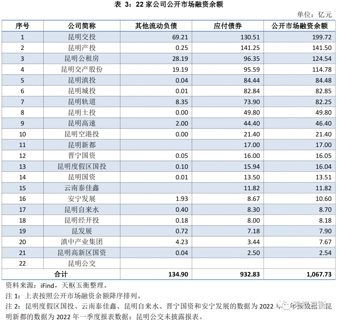 其中,公開市場(chǎng)融資余額最多的是昆明產(chǎn)投141億元,其次是昆明交投130億元,然后是昆明交產(chǎn)股份111億元,昆明公租房96億元,昆明滇投84億元,昆明城投83億元,昆明軌道74億元,昆明土投50億元,昆明高速44億元,昆明空港投21億元。