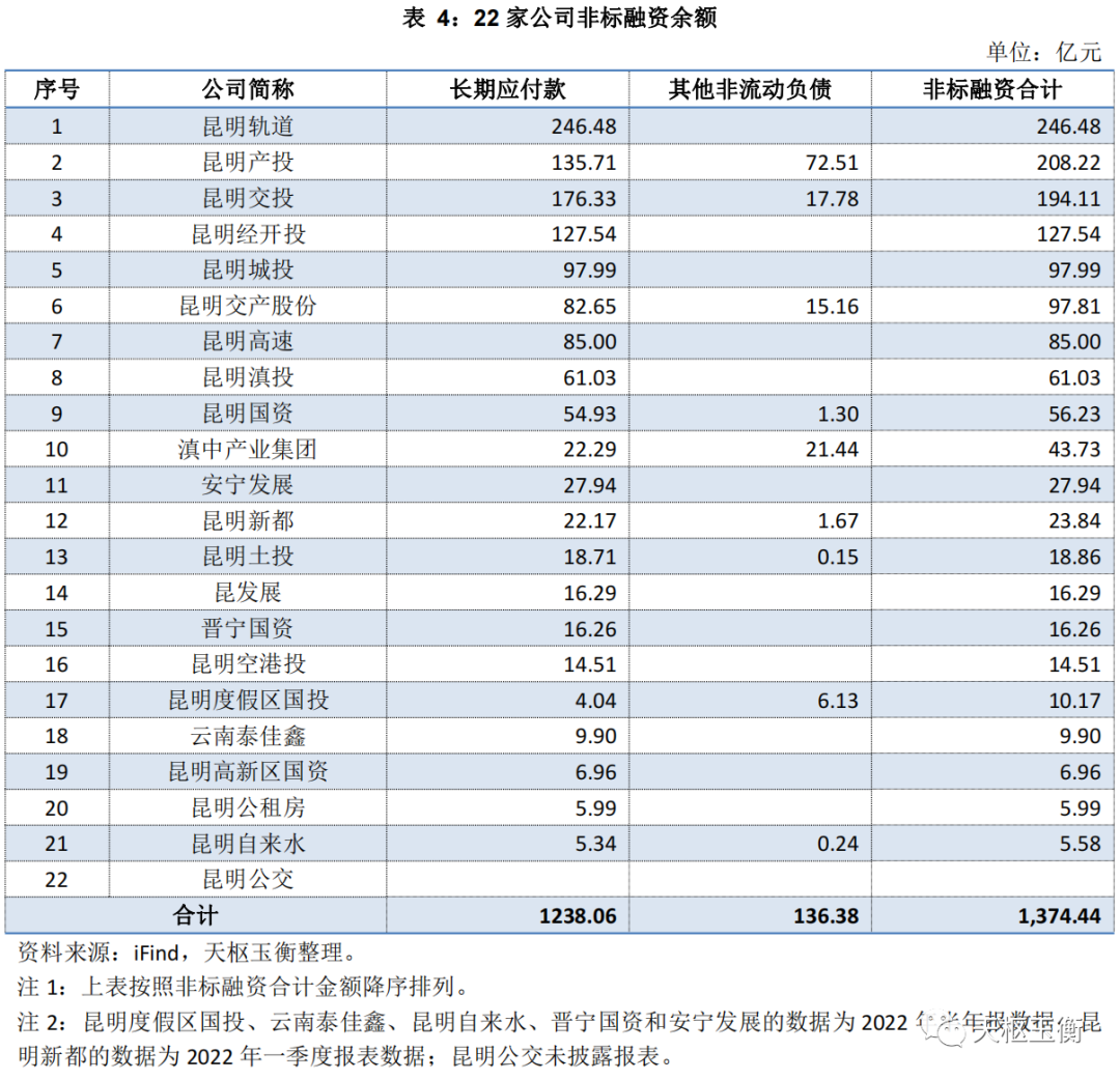 其他非流動(dòng)負(fù)債中往往包含著信托、資管、ABS等非標(biāo)融資,長期應(yīng)付款中含有大量的融資租賃及PPP后續(xù)應(yīng)付款,因此我們不精準(zhǔn)意義上的可以把長期應(yīng)付款余額定義非標(biāo)融資;這22家企業(yè)的非標(biāo)融資不低于136億元;其中,非標(biāo)融資最高的是昆明軌道247億元,昆明產(chǎn)投208億元,昆明交投194億元,昆明經(jīng)開投127億元,昆明城投98億元,昆明交產(chǎn)股份98億元,昆明高速85億元,昆明滇投61億元,昆明市國資公司55億元,安寧發(fā)展28億元。