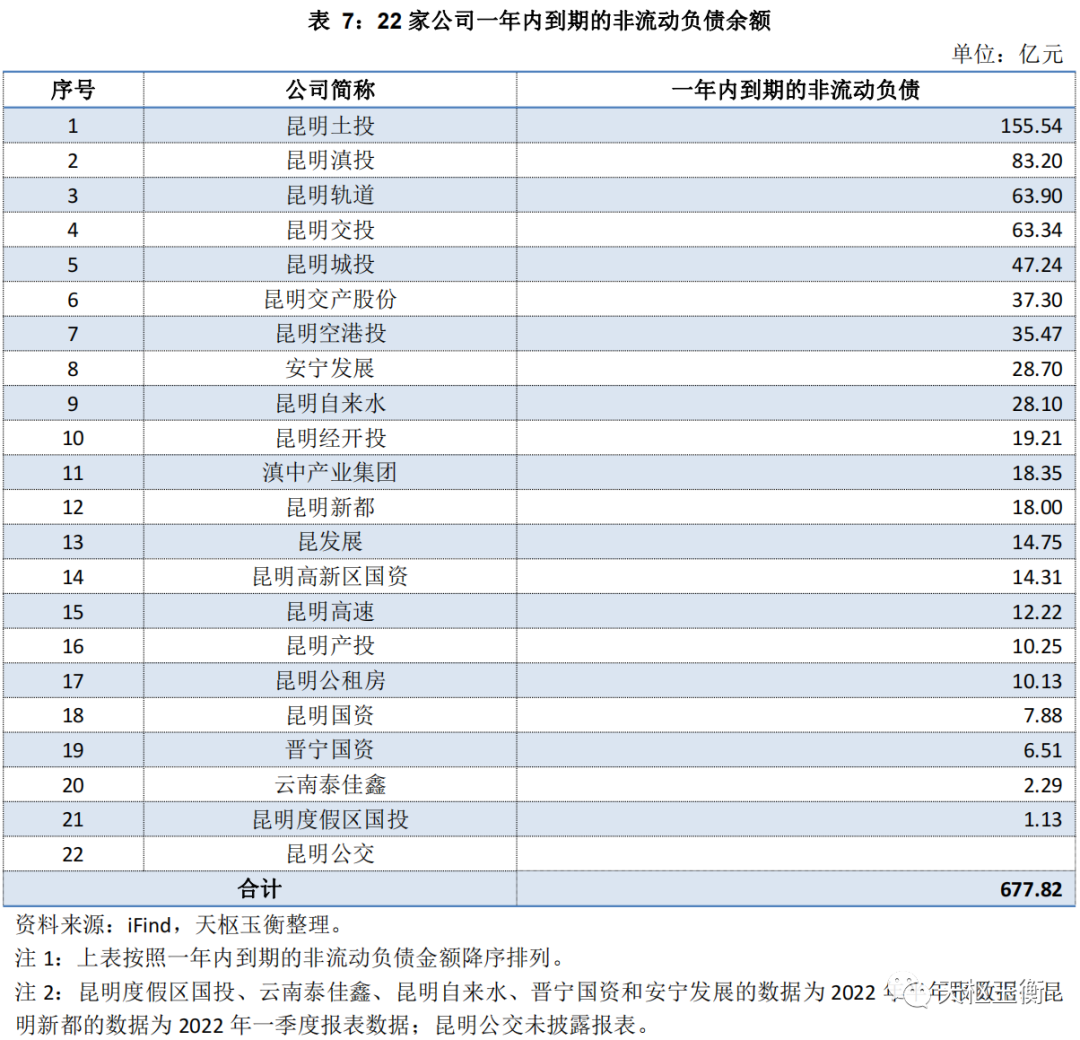 一年內(nèi)到期非流動(dòng)負(fù)債余額方面,昆明土投155億元排第一,昆明滇投83億元排第二,昆明軌道64億元排第三,昆明交投63億元排第四,昆明城投47億元排第五;