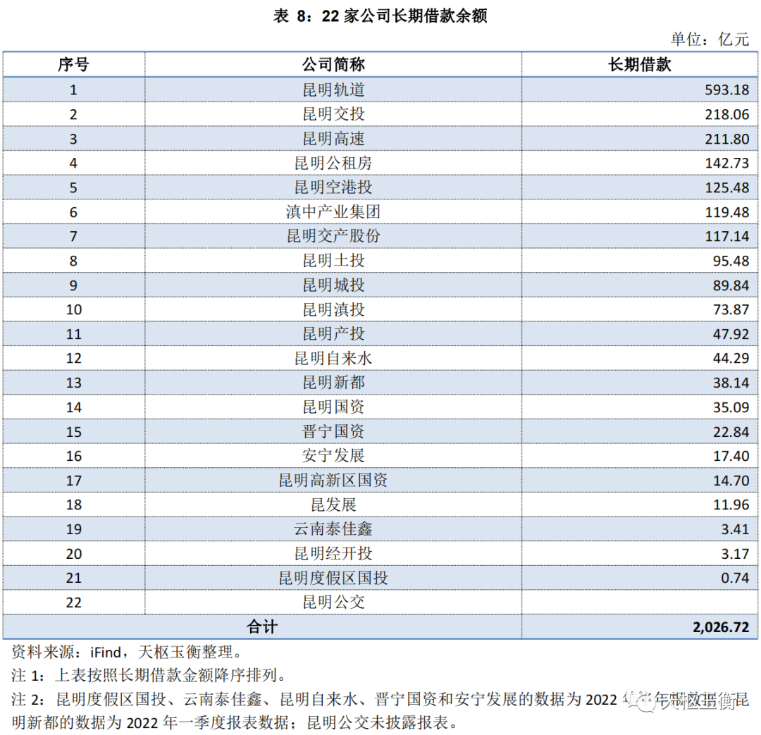 長期借款余額方面,昆明軌道593億元排第一,昆明交投218億元排第二,昆高速212億元排到第三,公租房143億元排第四,滇中產(chǎn)業(yè)集團(tuán)120億元排第五。