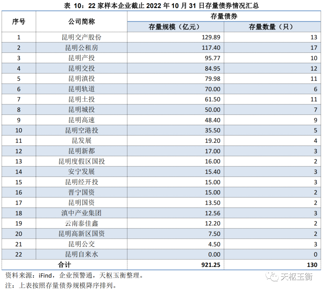 截止2022年10月31日,除昆明自來水公司已無存量債券外,其余21家企業(yè)合計(jì)存量債券130只,存量債券規(guī)模921.25億元。