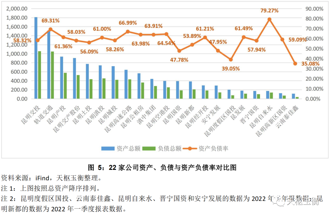 截至2022年10月31日,有22家昆明市及所屬縣區(qū)與滇中新區(qū)等的投融資公司(含公用事業(yè)企業(yè),具體名單見表1)有公開市場(chǎng)融資而披露了他們2022年的三季報(bào),我們也根據(jù)iFind系統(tǒng)等的查詢,簡(jiǎn)要分析它們的債務(wù)情況。