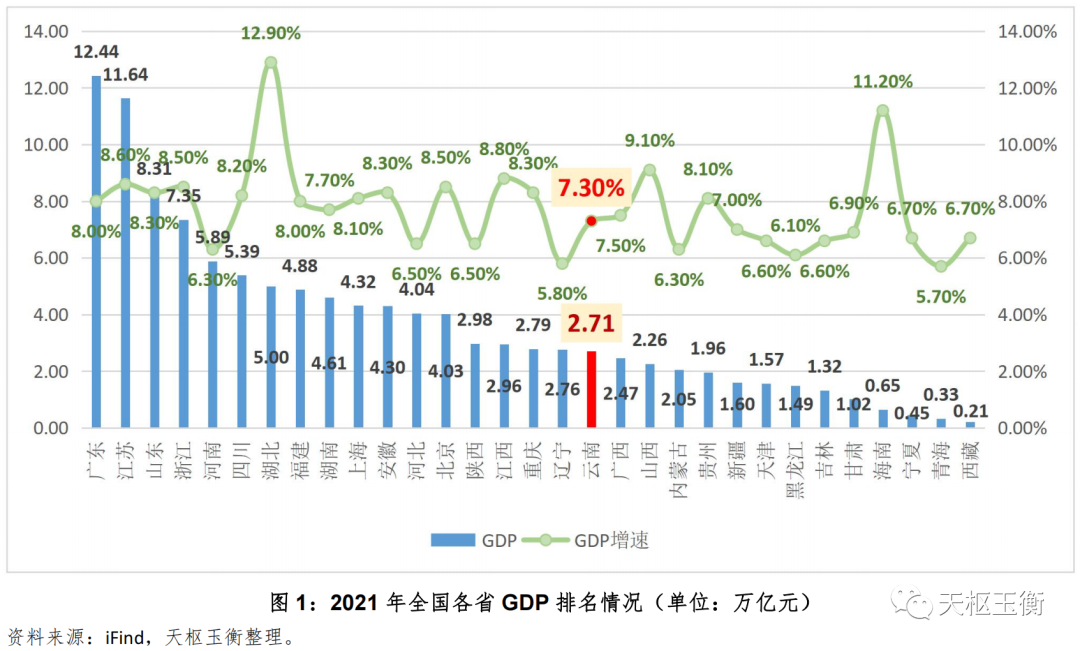 近年來,云南省地方經(jīng)濟不斷發(fā)展,2021年經(jīng)濟總量為27,146.76億元,在全國排名18位,位居中下;2021年GDP增速為7.3%,低于全國平均水平0.8個百分點。