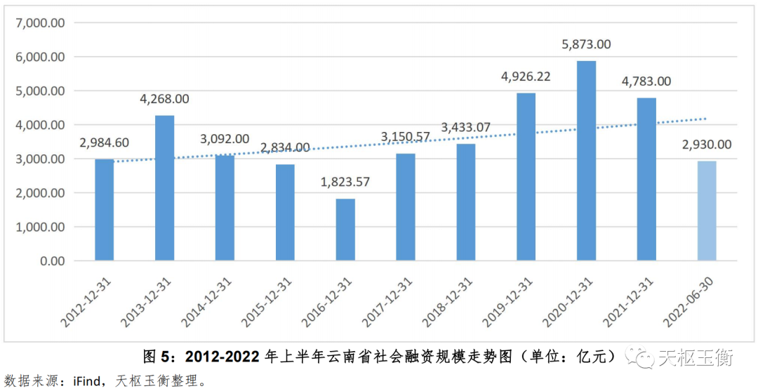 截止2022年上半年,云南省社會融資規(guī)模為2,930億元。其中:人民幣貸款2,024億元,政府債券961億元。