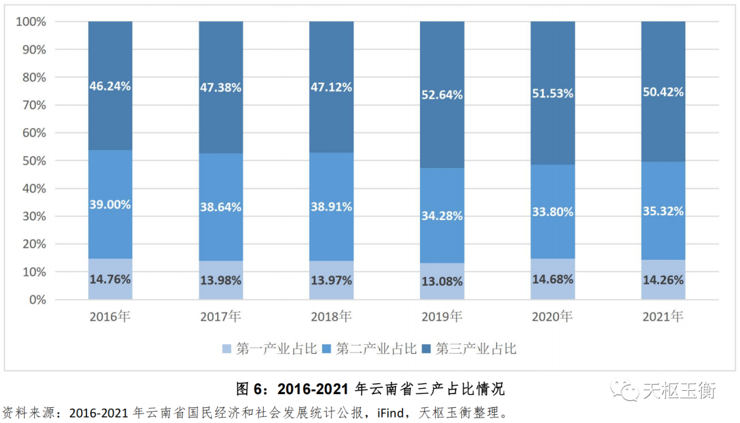 云南省三次產(chǎn)業(yè)結(jié)構(gòu)由2016年的14.8:39.0:46.2調(diào)整為2021年的14.3:35.3:50.4,形成了“三二一”的產(chǎn)業(yè)格局,以二、三產(chǎn)業(yè)為主,且第三產(chǎn)業(yè)占比有所提高,而第一、二產(chǎn)業(yè)占比均有所下降。