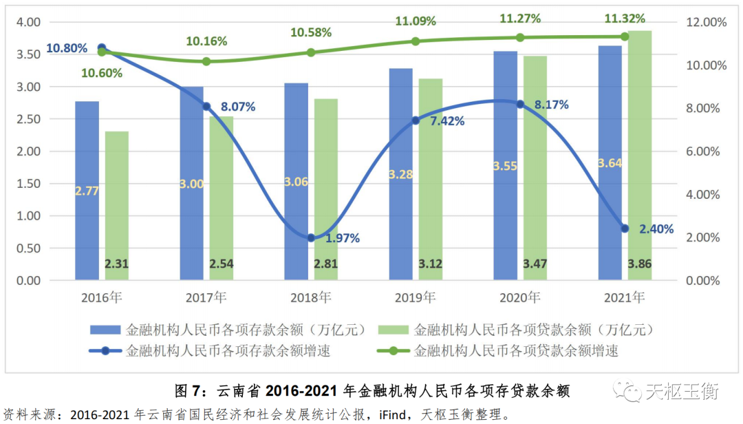 金融業(yè)方面,云南省金融總量持續(xù)擴張。近三年全省金融機構(gòu)人民幣各項存款余額保持增長,但2021年增速較回落較多,金融機構(gòu)人民幣各項貸款余額增速保持在11%左右,處于較快水平。2021年也是近年來,唯一貸款余額超越存款余額的一年。