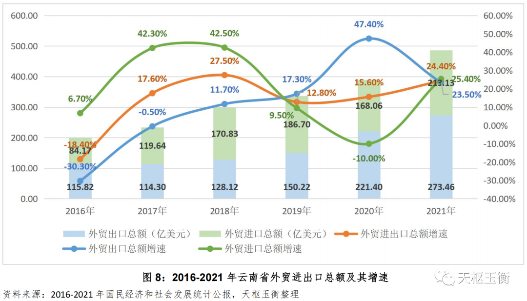 在國內(nèi)貿(mào)易和對外經(jīng)濟方面,2021年云南省全年社會消費品零售總額10731.80億元,比上年增長9.6%,全年外貿(mào)進出口總額486.59億美元,比上年增長24.4%。