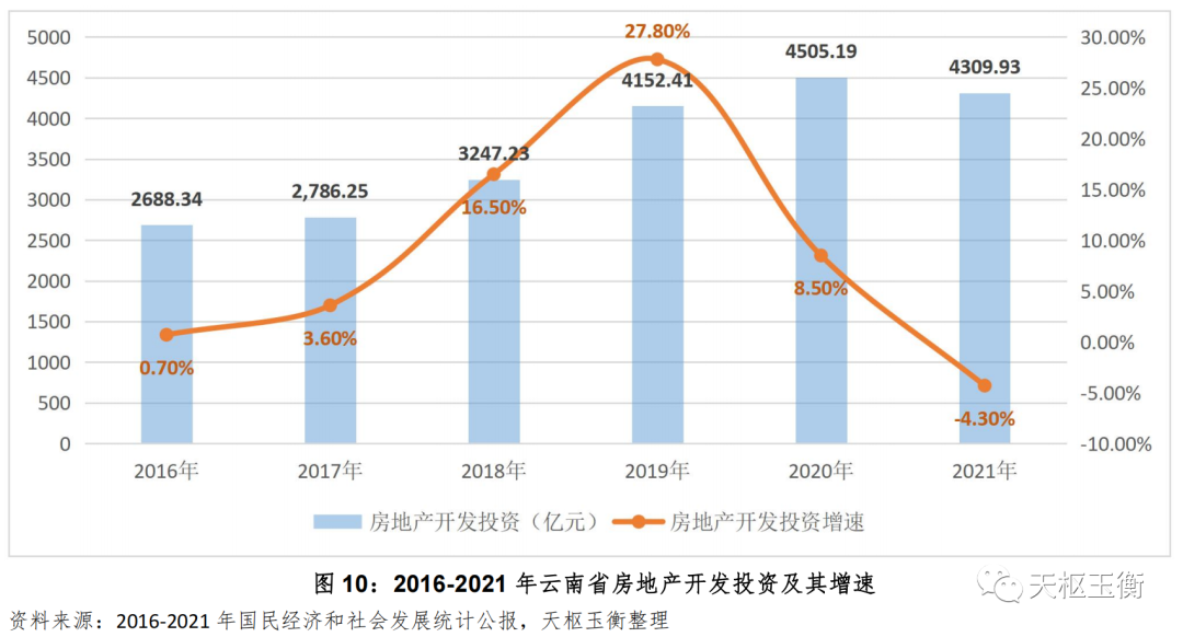 在固定資產(chǎn)投資和房地產(chǎn)業(yè)方面,2021年云南省年固定資產(chǎn)投資(不含農(nóng)戶)比上年增長4.0%;但全年房地產(chǎn)開發(fā)投資4309.93億元,比上年下降4.3%。