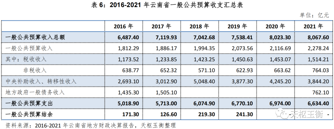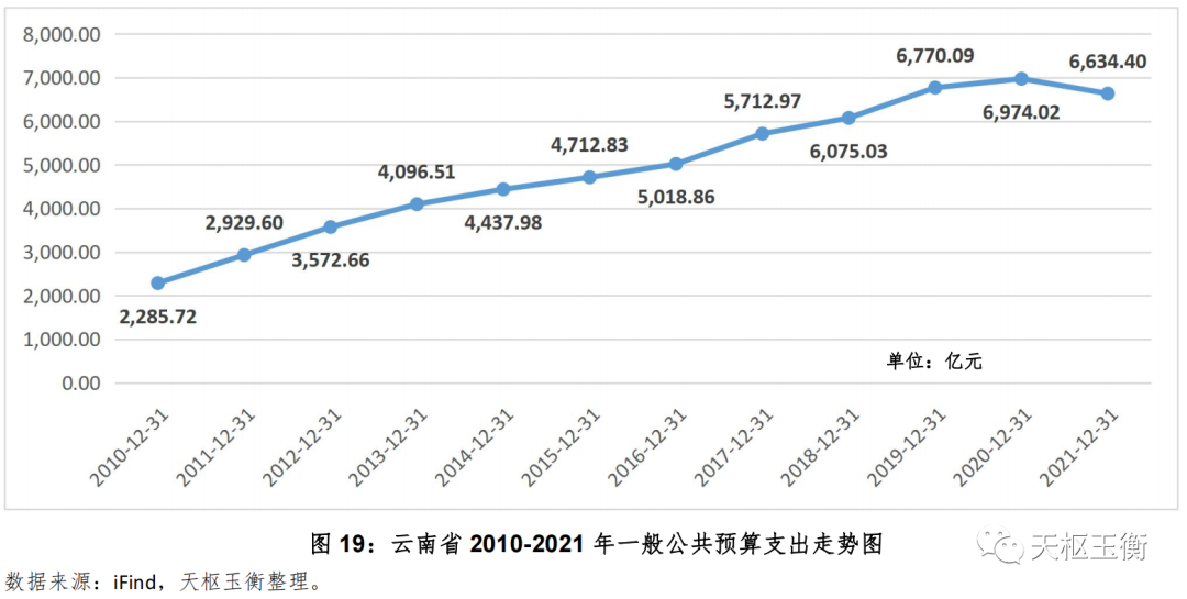 根據(jù)云南省地方財政決算報告披露,近六年來云南省一般公共預算支出總額,每兩年即有一個飛躍:2016-2017年政府性基金預算收入為1,000億級、2018-2019年為2,000億級、2020-2021年為3,000億級。
