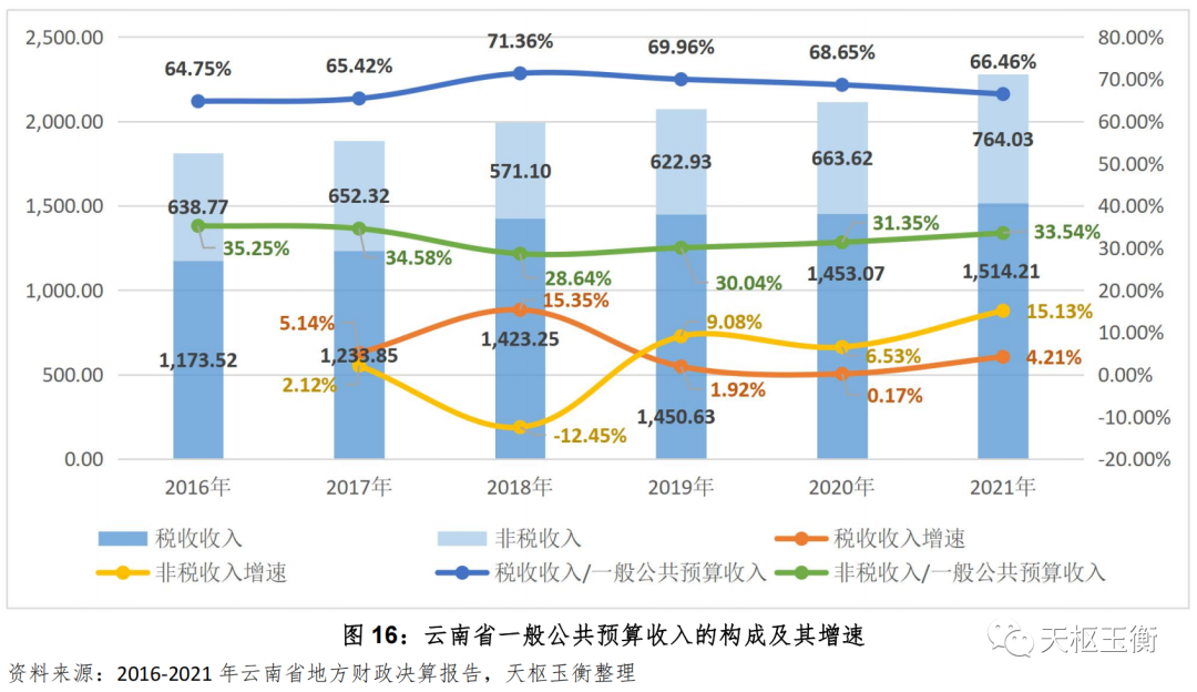 從收入構(gòu)成來看,云南省一般公共預算收入以稅收收入為主,近年來稅收收入占一般公共預算收入的比重穩(wěn)定在65%上下,但稅收收入的增速較為緩慢;2019年開始,非稅收入的增速超越了稅收收入。