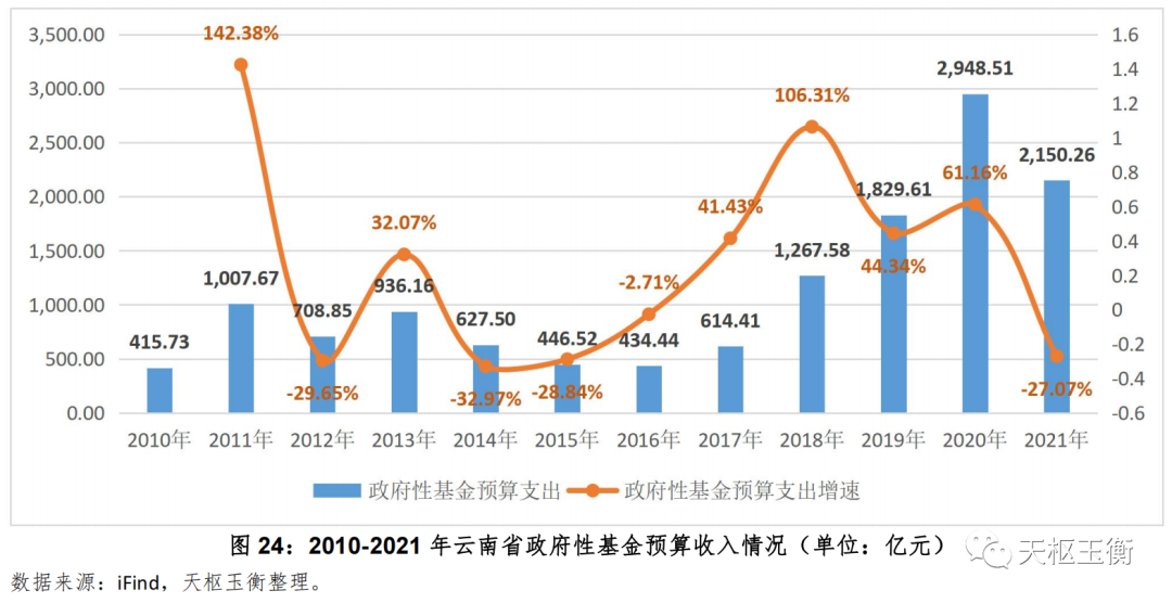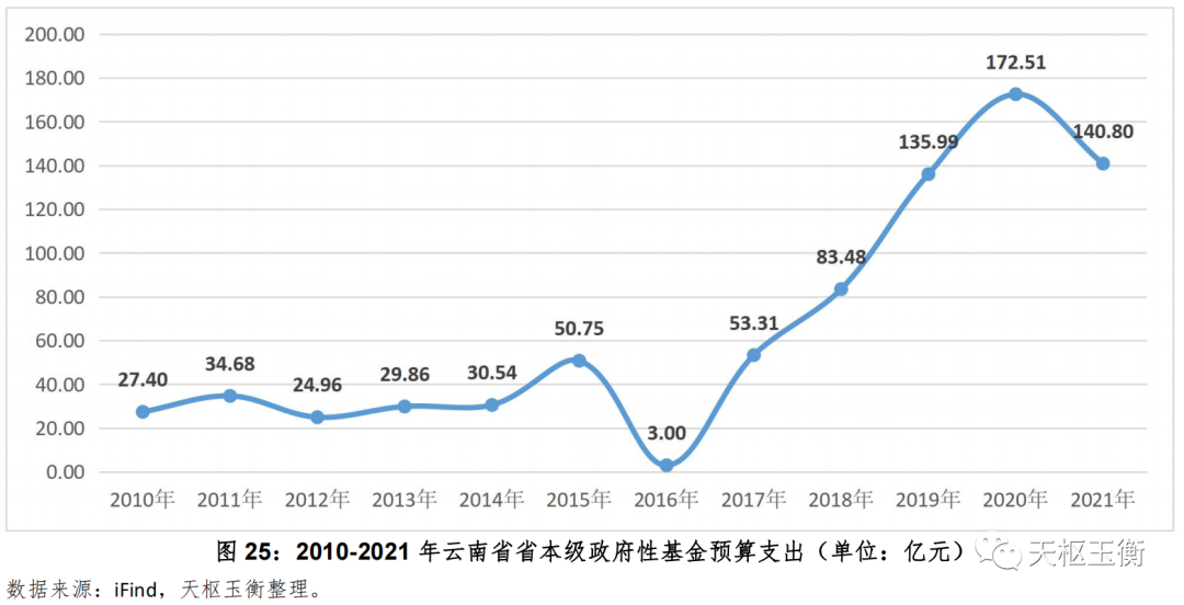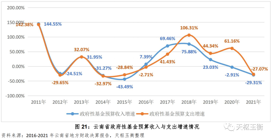 自2018年至今,云南省政府性基金預算支出的增速就始終高于政府性基金預算收入的增速。此外,政府性基金預算收入自2020年開始負增長,2021年增速為-30%;政府性基金預算支出在2021年的增速為-27%。