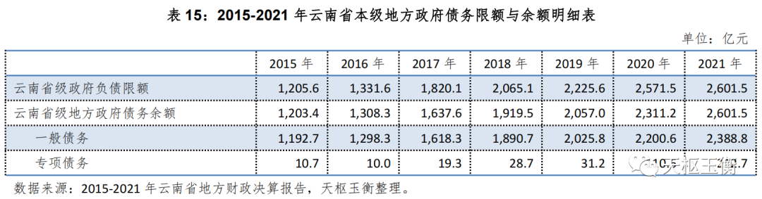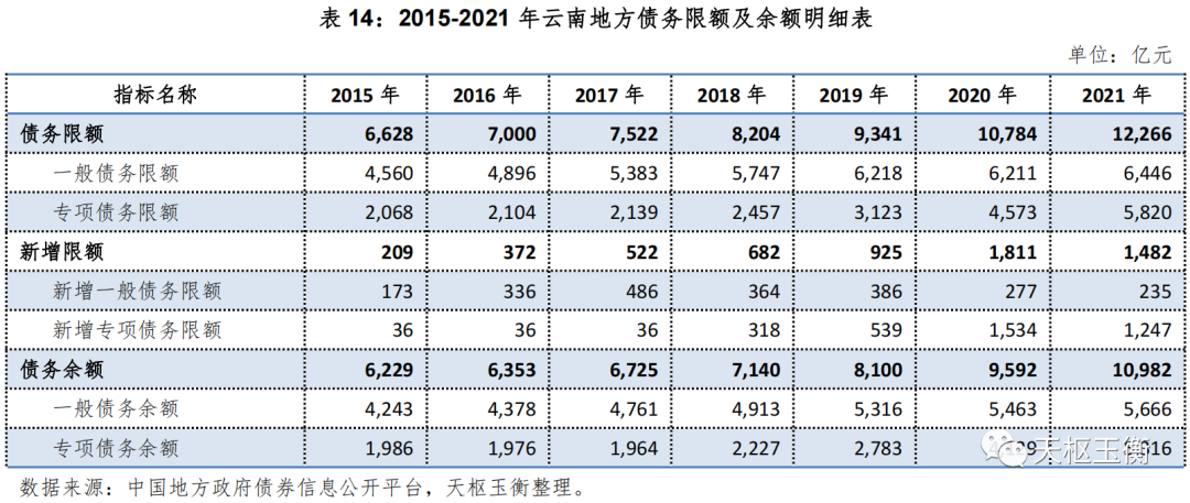 2021年云南省地方債務(wù)限額12,266億元,其中:一般債務(wù)限額6,446億元,專項債務(wù)限額5,820億元;新增債務(wù)限額為1,482億元,其中:新增一般債務(wù)限額235億元,新增專項債務(wù)限額1,247億元。