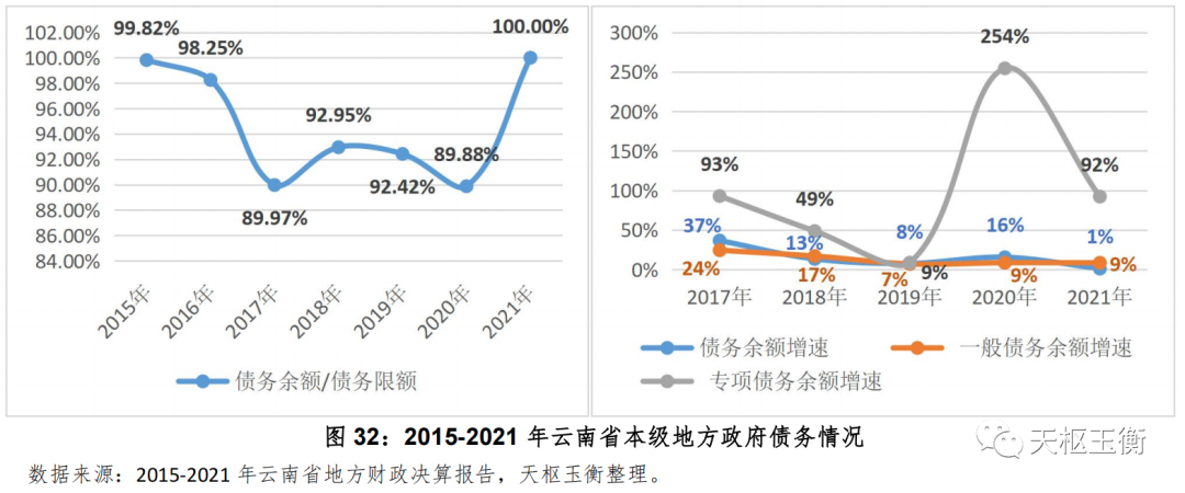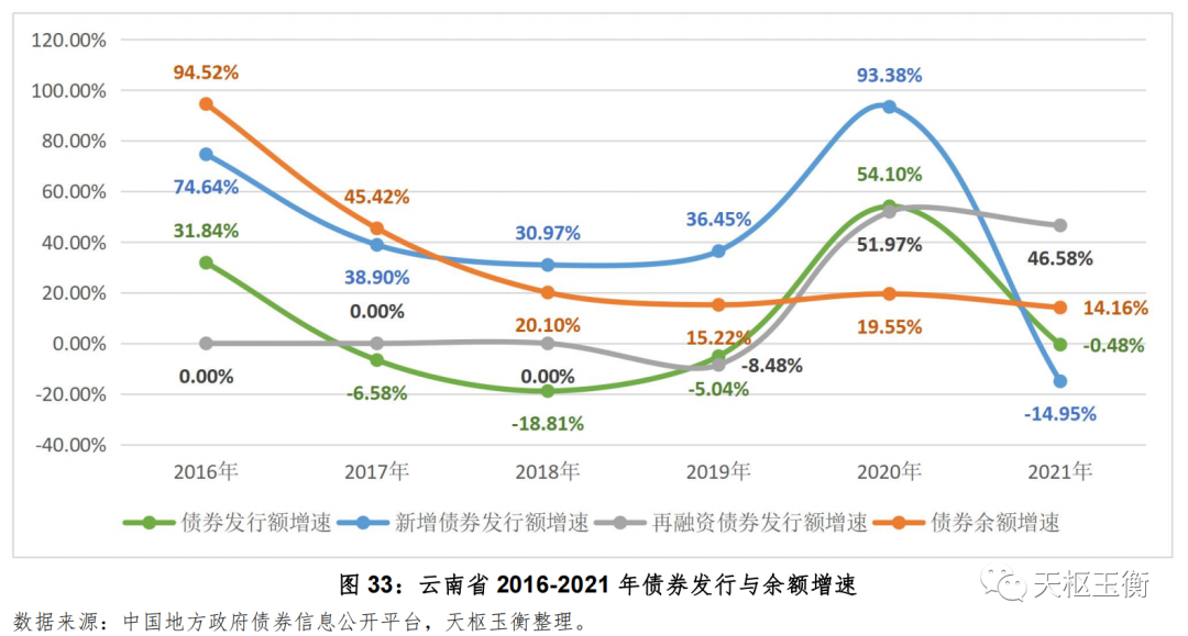 從債券余額的增速來看,近年來云南省專項債務(wù)的增速較為明顯,尤其在2020年一度增速接近50%;一般債務(wù)則保持較為緩慢的增長。