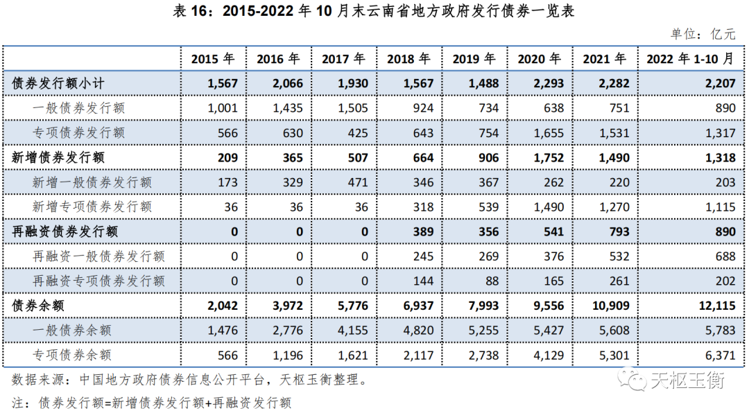 2022年1-10月,云南省地方政府合計發(fā)行債券2,207億元。其中,新增債券1,318億元,發(fā)行再融資債券890億元,截止2022年10月末,債券余額為12,115億元。