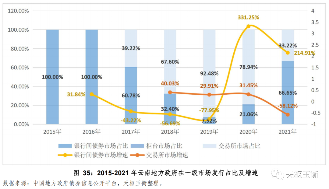 從在各個市場發(fā)行金額的占比來看,云南地方政府債券在2015-2016年都集中在銀行間債券市場發(fā)行,2021年又重新回到主導地位;2017年開始,云南地方政府債券開始在交易所市場發(fā)現(xiàn),并迅速擴大其占比,在2019年時達到峰值。