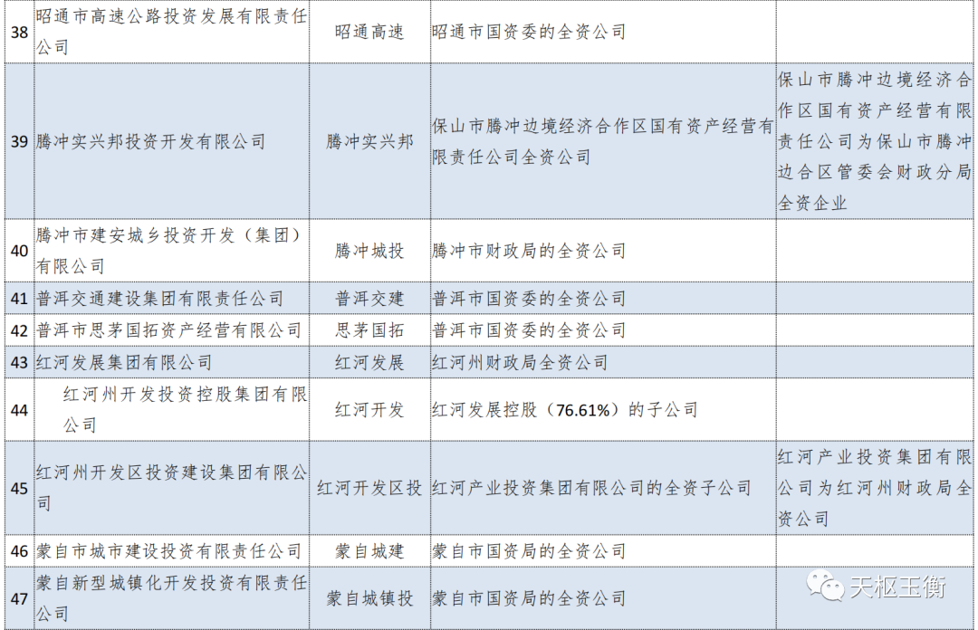 一是,本文所指云南省內(nèi)各投融資平臺公司,指由地方政府及其部門和機構(gòu)等通過財政撥款或注入土地、股權(quán)等資產(chǎn)設(shè)立,承擔政府投資項目融資功能,并擁有獨立法人資格的經(jīng)濟實體。包括各類綜合性投資公司,如建設(shè)投資公司、建設(shè)開發(fā)公司、投資開發(fā)公司、投資控股公司、投資發(fā)展公司、投資集團公司、國有資產(chǎn)運營公司、國有資本經(jīng)營管理中心等,以及行業(yè)性投資公司,如交通投資公司、土地開發(fā)投資公司等。