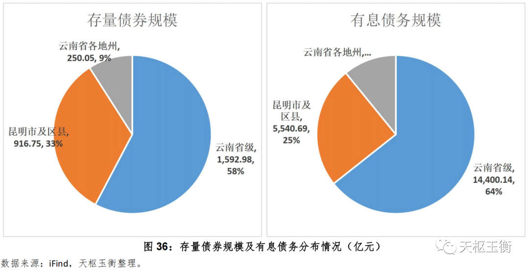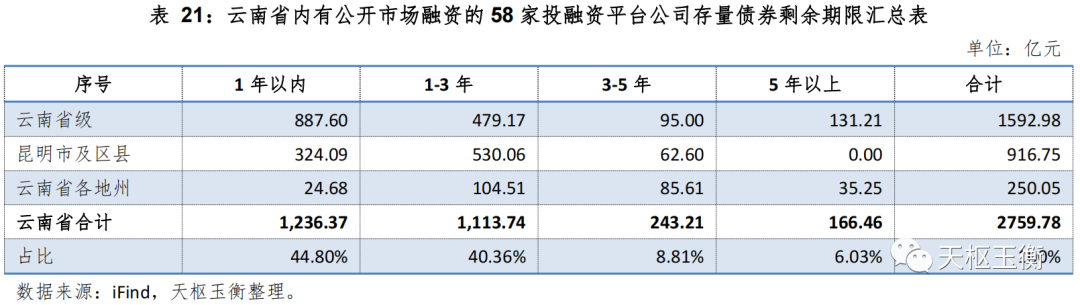 有公開發(fā)債的投融資平臺的有息債務(wù)合計22,225.43億元,其中,云南省級企業(yè)有息債務(wù)合計14,400.14億元,占全省存量債券規(guī)模的64%;昆明市及區(qū)縣企業(yè)有息債務(wù)合計5,540.69億元,占全省存量債券規(guī)模的25%;云南省各地州企業(yè)有息債務(wù)合計2,434.94億元,占全省存量債券規(guī)模的11%。