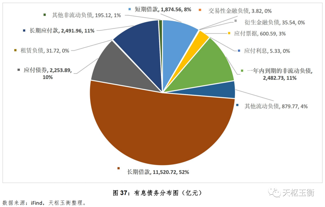 其中:其他流動負債通常核算短期融資券融資,其他非流動負債中往往包含著信托、資管、ABS等非標融資,長期應付款中含有大量的融資租賃及PPP后續(xù)應付款,但并非其他流動負債、其他非流動負債和長期應付款全部都是有息債務(wù),鑒于企業(yè)未披露具體的財務(wù)報表附注,本文不精準的將其均歸為有息負債,因此實際對外的有息負債余額同樣要少于上述數(shù)據(jù),但不影響整體情況;