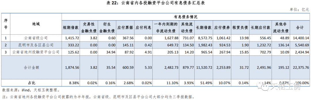 截止2022年10月31日,云南省、昆明市及云南各州市所屬投融資平臺公司共計58家企業(yè)有發(fā)行各類存量債券2759.78,有息債務(wù)金額合計22,357.76億元。