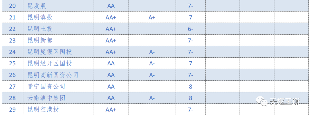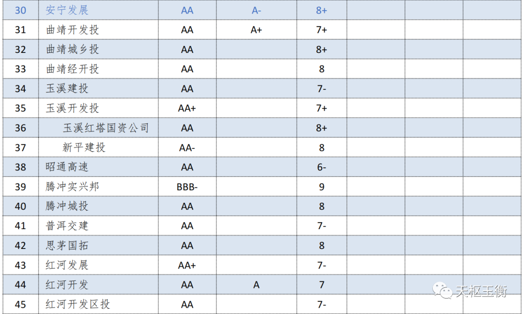 分層級來看:云南省級平臺公司主體評級均為AAA(4家)或AA+(6家);昆明市級及區(qū)縣級平臺公司中,AAA評級企業(yè)2家,AA+評級10家,AA評級8家;云南省地州級平臺公司中,2家企業(yè)主體評級為AA+,20家企業(yè)為AA,AA-企業(yè)4家,BBB-企業(yè)1家,另有1家企業(yè)系發(fā)行項目收益?zhèn)醋銎髽I(yè)主體評級。
