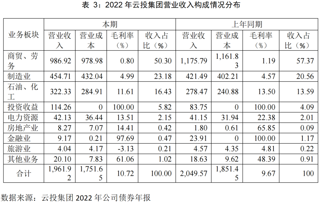 2022年云投集團(tuán)本部及合并范圍合計(jì)實(shí)現(xiàn)營業(yè)收入1961.92億元,其中商貿(mào)、勞務(wù)收入合計(jì)986.92億元,占比50.30%,毛利率低到0.8%。