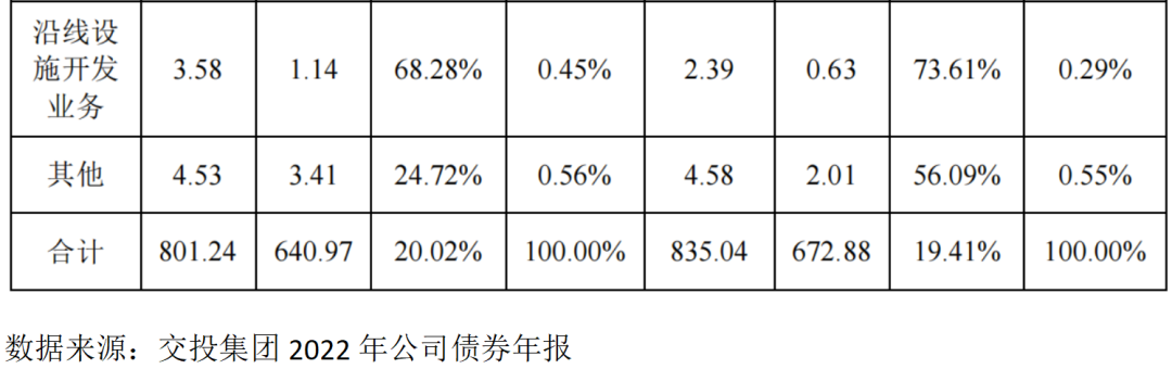2022年交投集團(tuán)本部及合并范圍合計(jì)實(shí)現(xiàn)營業(yè)收入801.24億元,其中車輛通行費(fèi)收入127.51億元,占比15.91%,但毛利率高達(dá)57.20%;工程施工收入合計(jì)401億元,占比50.05%,毛利率18.56%;另外銷售收入241.76億元,占比30.17%,毛利率低至3.92%。