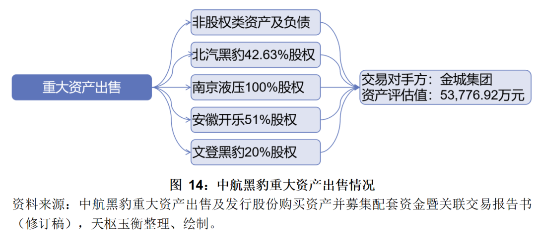 中航黑豹擬以現(xiàn)金方式向金城集團(tuán)出售截至2016831日除上海航空特種車輛有限責(zé)任公司66.61%股權(quán)外的全部資產(chǎn)及負(fù)債,具體包括本部非股權(quán)類資產(chǎn)及負(fù)債、北汽黑豹(威海)汽車有限公司42.63%股權(quán)、南京金城液壓工程有限公司100%股權(quán)、安徽開(kāi)樂(lè)專用車輛股份有限公司51%股權(quán)、山東文登黑豹汽車有限公司20%股權(quán)。擬出售資產(chǎn)的評(píng)估值為53,776.92萬(wàn)元。