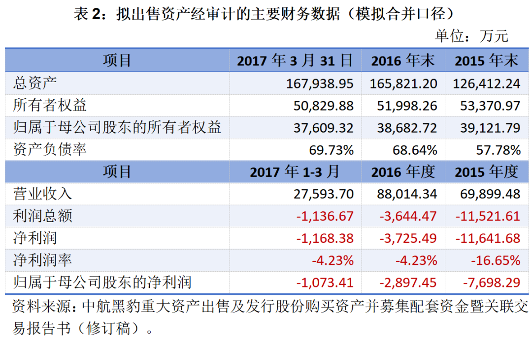 本次出售的除上航特66.61%股權(quán)外的全部資產(chǎn)和負(fù)債,截止20173月末,模擬合并口徑下總資產(chǎn)合計(jì)16.79億元,凈資產(chǎn)5.08億元,資產(chǎn)負(fù)債率為69.73%;20171-3月累計(jì)實(shí)現(xiàn)營(yíng)業(yè)收入2.76億元,但歸母凈利潤(rùn)虧損1,073.41萬(wàn)元。