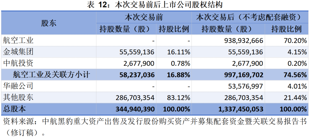 至此,本次重組擬購(gòu)買(mǎi)資產(chǎn)的交易價(jià)格797,977.77萬(wàn)元,按照擬購(gòu)買(mǎi)資產(chǎn)股份發(fā)行價(jià)格8.04/股計(jì)算,不考慮配套融資,本次交易前后,中航黑豹股權(quán)結(jié)構(gòu)如下表所示: