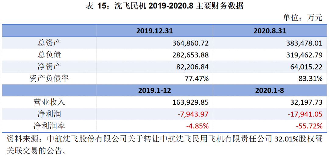 沈飛民機(jī)在2019-2020年前8個(gè)月一直處于虧損狀態(tài),且公司資產(chǎn)負(fù)債率只需攀升,主要財(cái)務(wù)數(shù)據(jù)如下表所示: