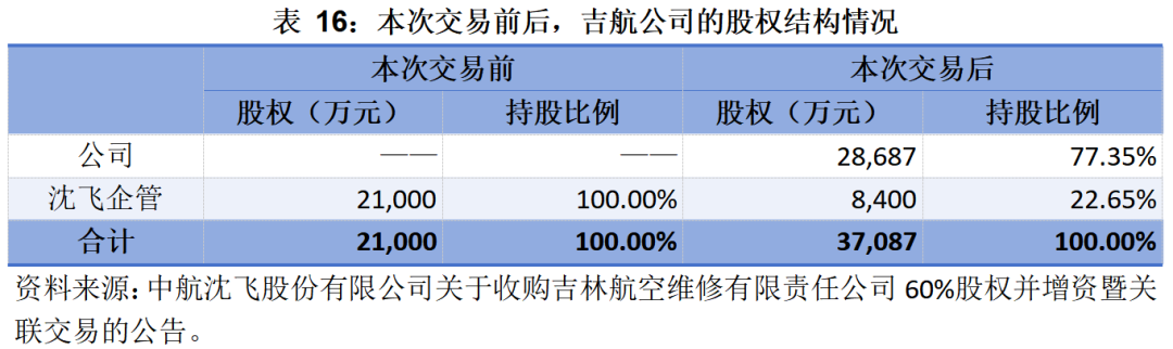 本次增資后,吉航公司的注冊(cè)資本將由21,000萬(wàn)元增加至37,087萬(wàn)元;本次交易完成后,中航沈飛將持有吉航公司77.35%股權(quán)并成為其控股股東。