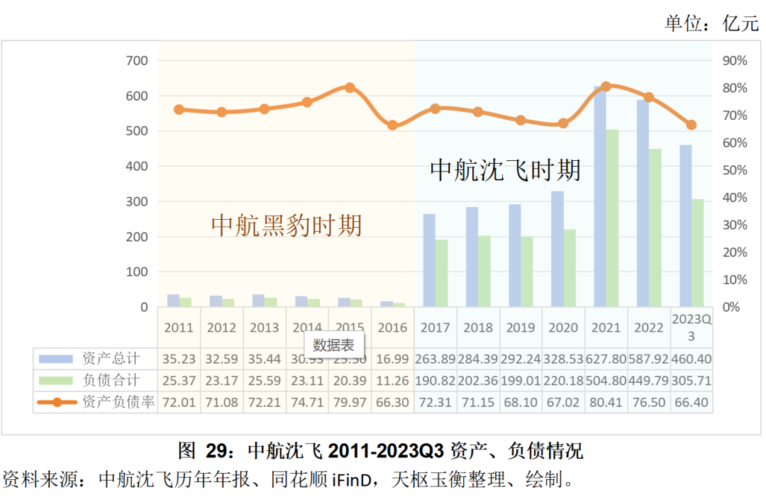 截止2023年三季度末,中航沈飛的資產(chǎn)總額為460.40億元,較2022年末減少21.69%,負(fù)債總額為305.71億元,較2022年末減少32.03%;公司資產(chǎn)負(fù)債率為66.40%,較2022年末減少10.1個(gè)百分點(diǎn)。