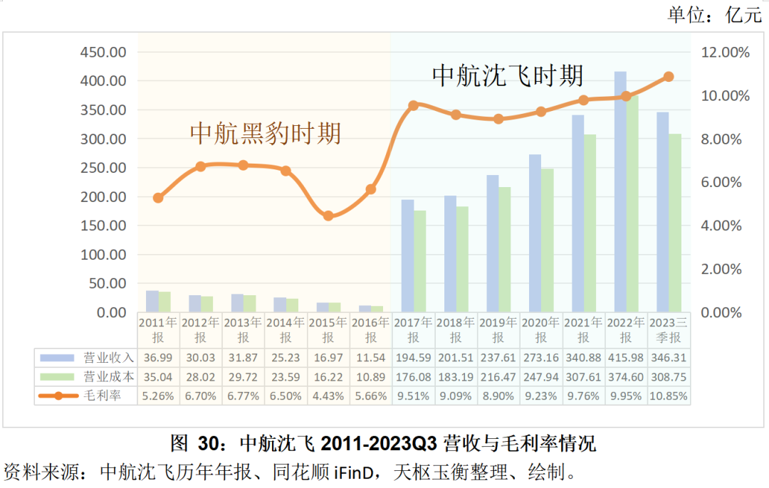 2023年三季度,中航沈飛累計(jì)實(shí)現(xiàn)營(yíng)業(yè)收入346.31億元,同比增長(zhǎng)14.38%;自2016年公司完成重大重組后,中航沈飛的毛利率一直穩(wěn)定在9%-10%附近,較中航黑豹時(shí)期有較大改善。