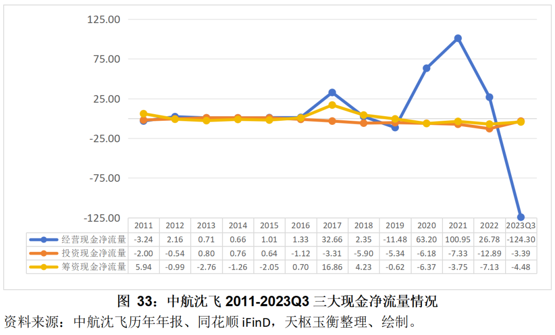 三大現(xiàn)金凈流量方面,中航沈飛的經(jīng)營(yíng)現(xiàn)金凈流量波動(dòng)較大,截止2023年三季度,公司經(jīng)營(yíng)活動(dòng)產(chǎn)生的現(xiàn)金流量?jī)纛~比上年同期減少193.99以元變動(dòng)幅度高達(dá)-265.17%。