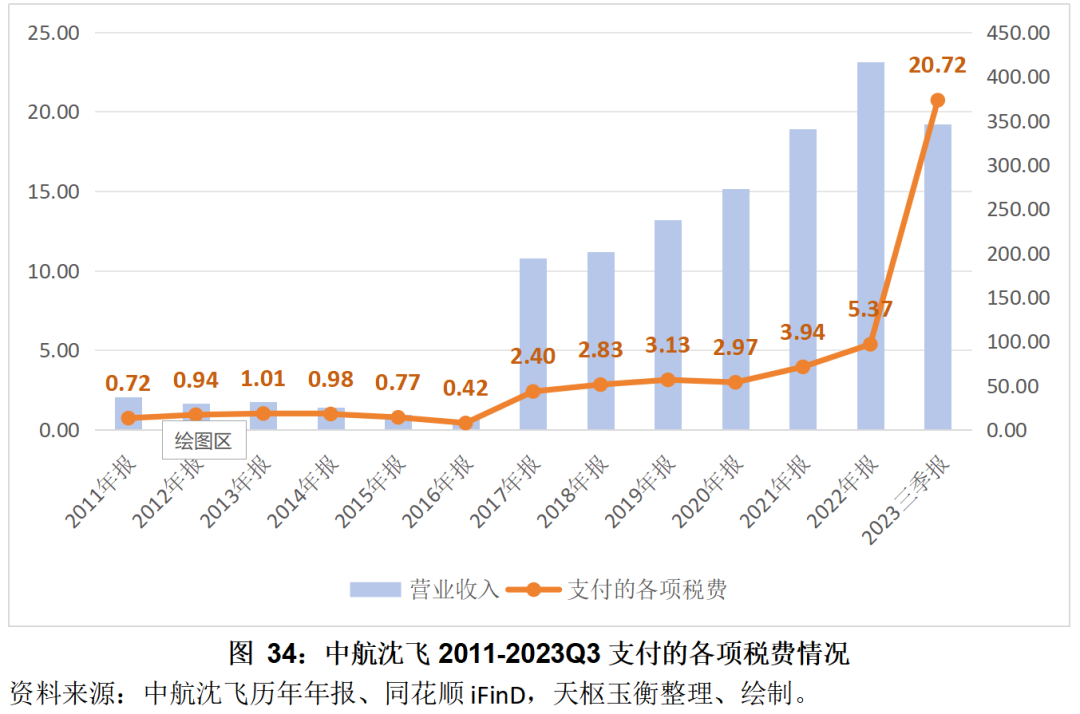 2016年中海沈飛重組完成后,公司支付的各項(xiàng)稅費(fèi)不斷攀升,截止2023年前三季度,中航沈飛支付的各項(xiàng)稅費(fèi)合計(jì)20.72億元,較2022年同期激增575.84%