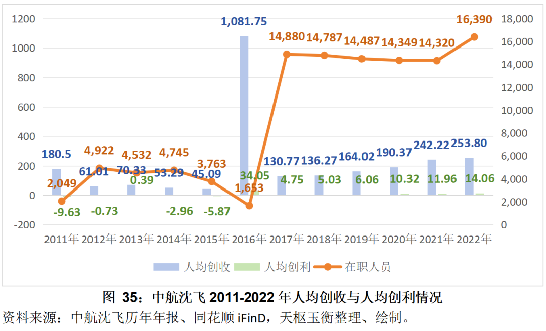 截止2022年末,中航沈飛在職員工人數(shù)共計(jì)16,390人,員工人均創(chuàng)收253.80萬(wàn)元,人均創(chuàng)立14.06萬(wàn)元,呈現(xiàn)逐年攀升的趨勢(shì)。