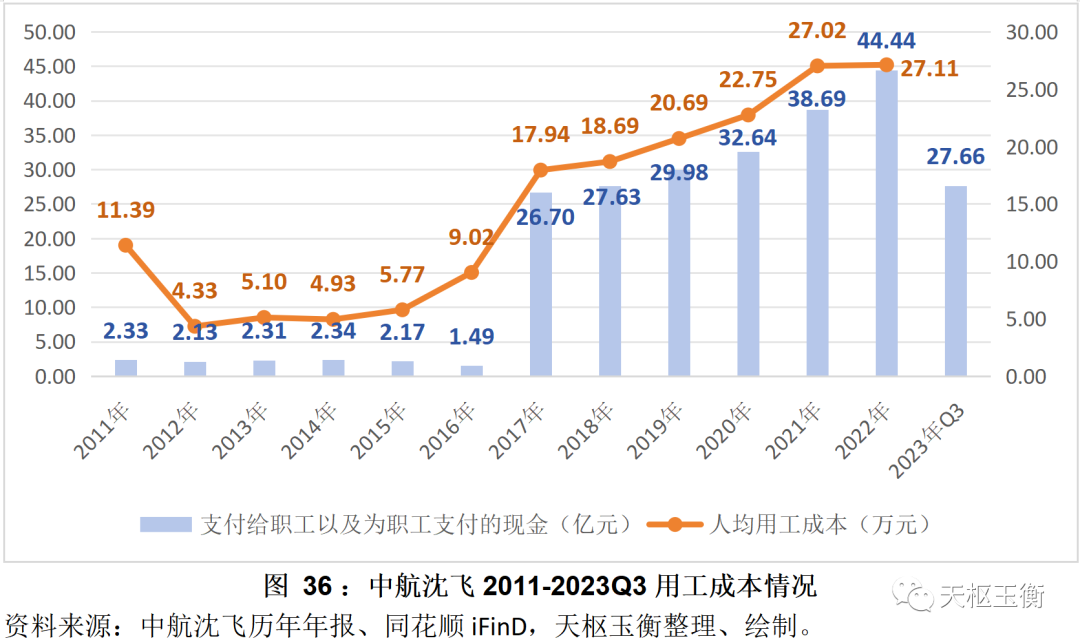 從支付給職工及為職工支付的現(xiàn)金來(lái)看,2016年以前,中航黑豹的人工成本較低;重大資產(chǎn)重組完成后,公司的用工成本不斷攀升,截至2022年末,公司用工成本為27.11萬(wàn)元//年,較2017年的17.94萬(wàn)元//年增長(zhǎng)了51.11%。