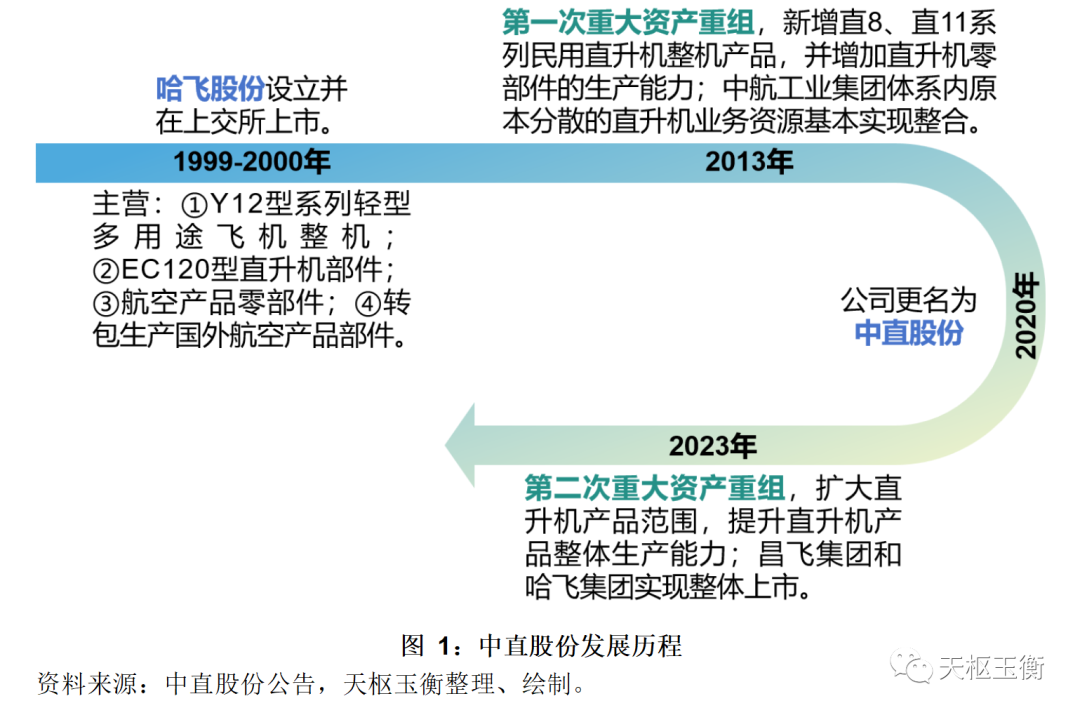 中直股份的前身哈飛股份于2000年在上海證券交易所上市,公司于2013年開展了第一次重大資產(chǎn)重組,整合了部分航空工業(yè)旗下直升機(jī)業(yè)務(wù)板塊,公司于2014年正式更名為中直股份。