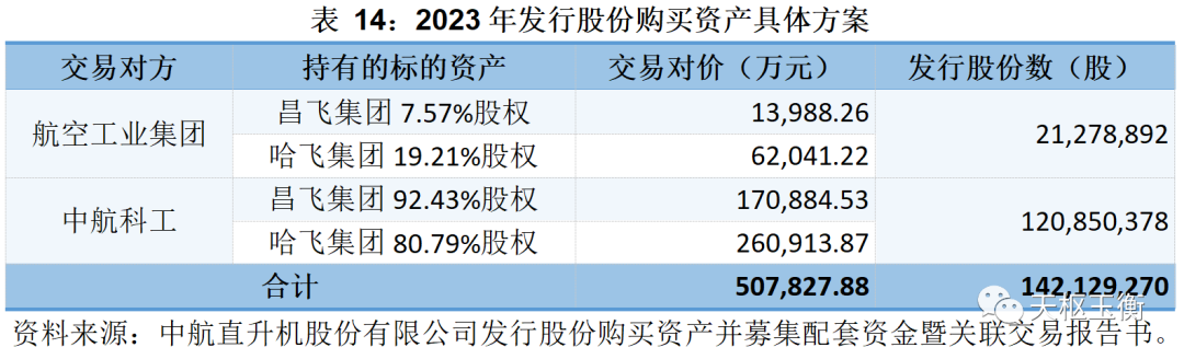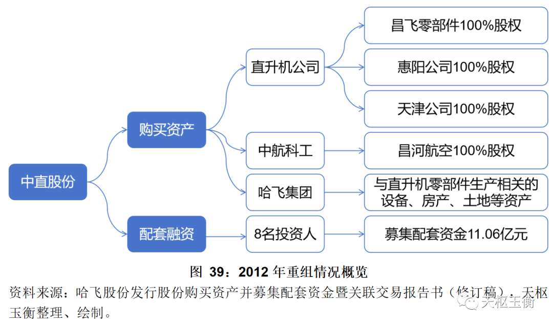 2013年,哈飛股份按照16.87/股的價(jià)格,向中航直升機(jī)有限責(zé)任公司、中國航空科技工業(yè)股份有限公司、哈爾濱飛機(jī)工業(yè)集團(tuán)有限責(zé)任公司合計(jì)發(fā)行196,826,716股股份,以總交易價(jià)格332,046.67萬元向直升機(jī)公司購買其持有的景德鎮(zhèn)昌飛航空零部件有限公司100%股權(quán)、惠陽航空螺旋槳有限責(zé)任公司100%股權(quán)、天津直升機(jī)有限責(zé)任公司100%股權(quán),向中航科工購買其持有的江西昌河航空工業(yè)有限公司100%股權(quán),向哈飛集團(tuán)購買其持有的與直升機(jī)零部件生產(chǎn)相關(guān)的資產(chǎn)。