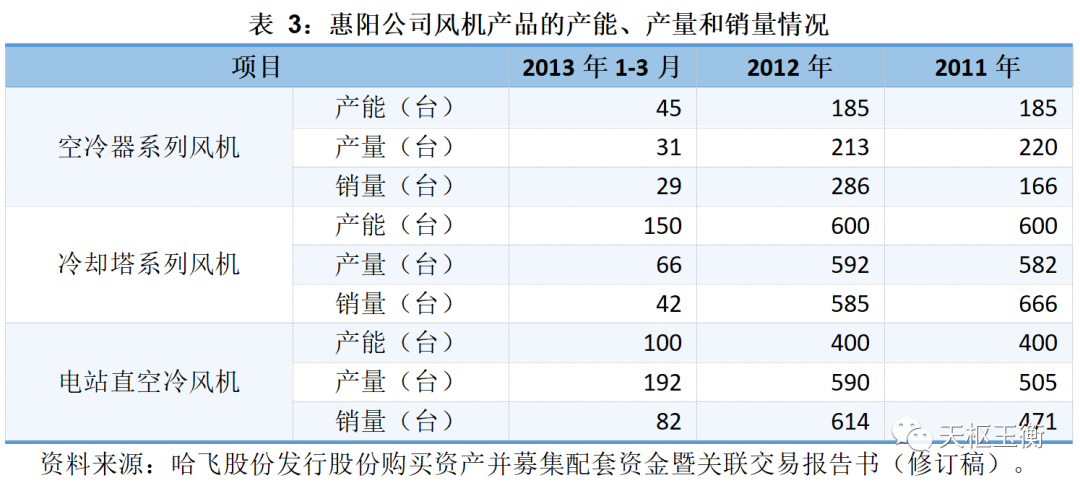 2011年至2013年一季度,惠陽公司風(fēng)機(jī)產(chǎn)品的產(chǎn)能、產(chǎn)量和銷量情況如下: