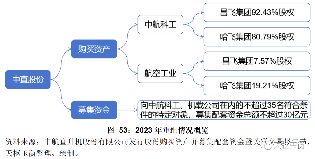 中直股份2001年上市,2013年發(fā)行股份整合航空工業(yè)集團(tuán)直升機(jī)整機(jī)及零部件生產(chǎn)相關(guān)的資產(chǎn);2023年擬發(fā)行股份購買昌飛集團(tuán)和哈飛集團(tuán)100%股權(quán),實(shí)現(xiàn)航空工業(yè)集團(tuán)直升機(jī)板塊的整體上市。