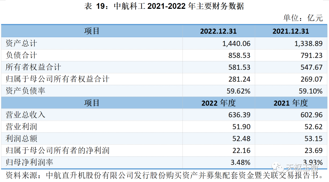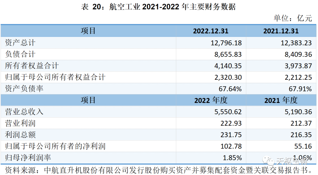 中航科工主營業(yè)務(wù)為防務(wù)產(chǎn)品及民用航空產(chǎn)品的開發(fā)、制造、銷售和改進(jìn),為國內(nèi)外客戶提供直升機(jī)、教練機(jī)、通用飛機(jī)、支線飛機(jī)、航空配套系統(tǒng)等產(chǎn)品及航空工程領(lǐng)域的規(guī)劃、設(shè)計(jì)和咨詢等服務(wù),并與其他航空產(chǎn)品制造商開展合作研發(fā)和生產(chǎn)。2021年及2022年的主要財(cái)務(wù)數(shù)據(jù)(合并報(bào)表)如下表所示: