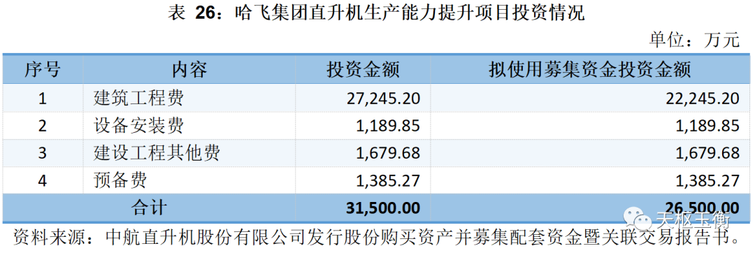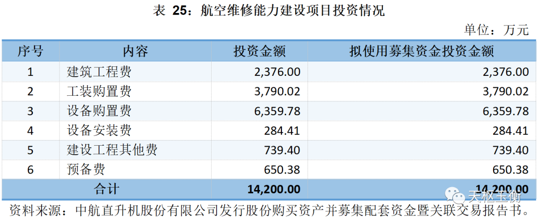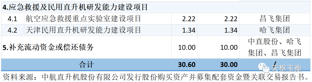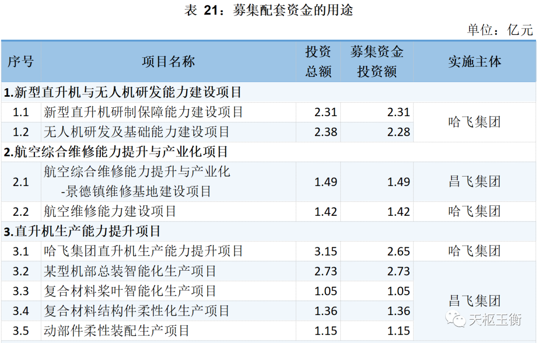 本次募集配套資金在扣除本次交易有關(guān)的稅費(fèi)及中介機(jī)構(gòu)費(fèi)用后,擬用于新型直升機(jī)與無人機(jī)研發(fā)能力建設(shè)項(xiàng)目、航空綜合維修能力提升與產(chǎn)業(yè)化項(xiàng)目、直升機(jī)生產(chǎn)能力提升項(xiàng)目等項(xiàng)目,以及補(bǔ)充本次交易后上市公司和標(biāo)的公司流動資金或償還債務(wù)。