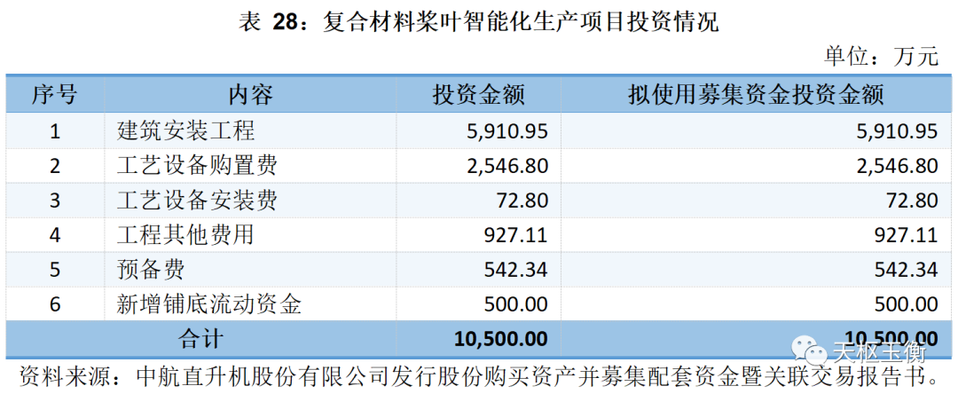 直升機(jī)復(fù)合材料構(gòu)件生產(chǎn)線擴(kuò)建項(xiàng)目總投資15,672萬元,其中固定資產(chǎn)總投資11,000萬元,主要用于建筑工程費(fèi)3,209.72萬元、設(shè)備費(fèi)6,176.04萬元、設(shè)備安裝費(fèi)239.38萬元、工程其他費(fèi)用310.62萬元、預(yù)備費(fèi)652.30萬元等;新增流動資金4,672萬元。